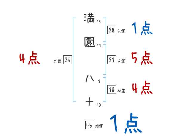 天運![]() | 満園八十さんの天運は28画の1つ星!家庭環境に注意。スポーツで活躍できる能力があるかも。 家系が持つ宿命的な運勢を表します。祖先から受け継いだ苗字ですので自分の力が及びません。家柄を象徴します。 |