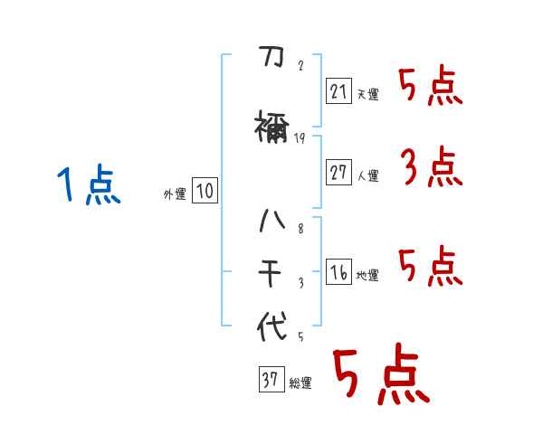 天運![]() | 刀禰八千代さんの天運は21画の5つ星!統率力がある。独立し成功する。名誉を手に入れる。 家系が持つ宿命的な運勢を表します。祖先から受け継いだ苗字ですので自分の力が及びません。家柄を象徴します。 |