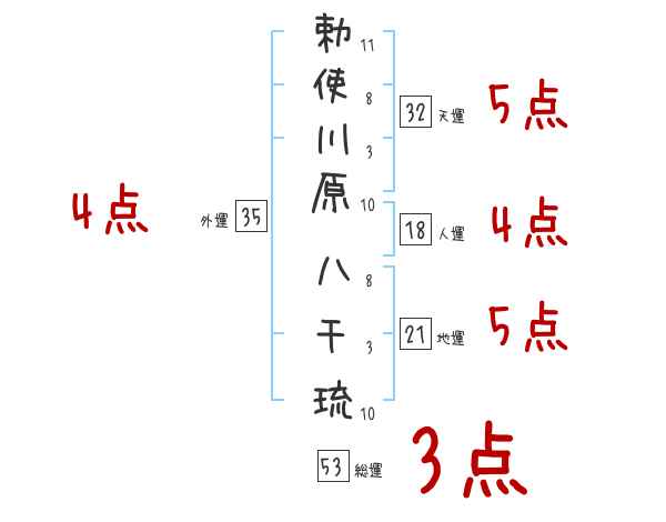 天運![]() | 勅使川原八千琉さんの天運は32画の5つ星!柔軟性があり成功する。チャンスが多く金運が良い。 家系が持つ宿命的な運勢を表します。祖先から受け継いだ苗字ですので自分の力が及びません。家柄を象徴します。 |