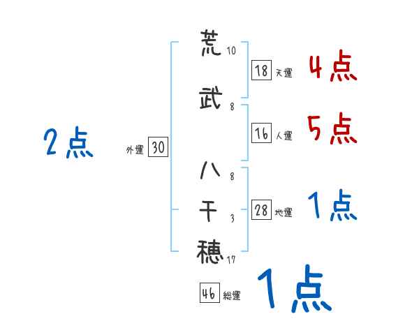 天運![]() | 荒武八千穂さんの天運は18画の4つ星!情熱的で剛気。忍耐力があり信頼される。 家系が持つ宿命的な運勢を表します。祖先から受け継いだ苗字ですので自分の力が及びません。家柄を象徴します。 |