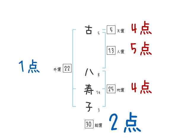 天運![]() | 古八寿子さんの天運は5画の4つ星!健康で安泰。協調性に優れ、財産に恵まれる。 家系が持つ宿命的な運勢を表します。祖先から受け継いだ苗字ですので自分の力が及びません。家柄を象徴します。 |