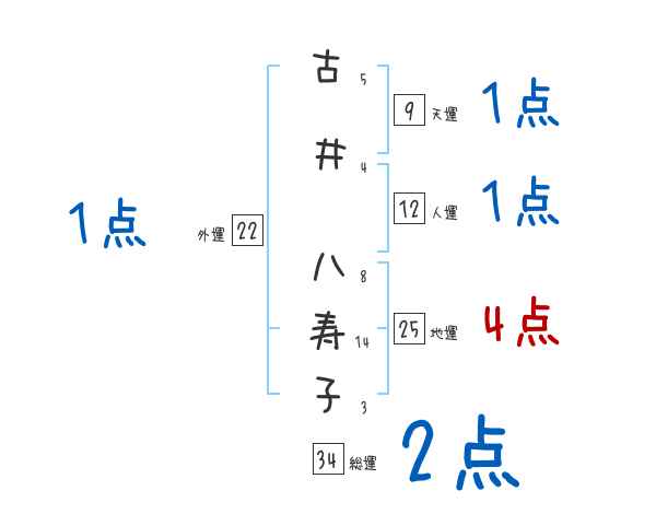 外運![]() | 古井八寿子さんの外運は22画の1つ星!努力することが苦手ないっぽう手先が器用。芸術性にも優れる。 生活面を象徴する運勢です。外部から受ける影響力を表し、結婚運、家庭運や職場、環境への順応性を表します。 |