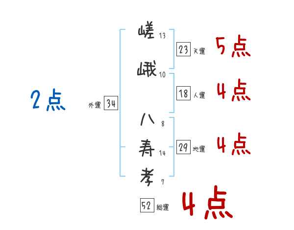 天運![]() | 嵯峨八寿孝さんの天運は23画の5つ星!想像力に優れ活力がある。一代で成功し名誉を手に入れる。 家系が持つ宿命的な運勢を表します。祖先から受け継いだ苗字ですので自分の力が及びません。家柄を象徴します。 |