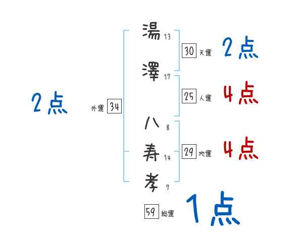 天運![]() | 湯澤八寿孝さんの天運は30画の2つ星!浮き沈みの激しさに注意しましょう。 家系が持つ宿命的な運勢を表します。祖先から受け継いだ苗字ですので自分の力が及びません。家柄を象徴します。 |
