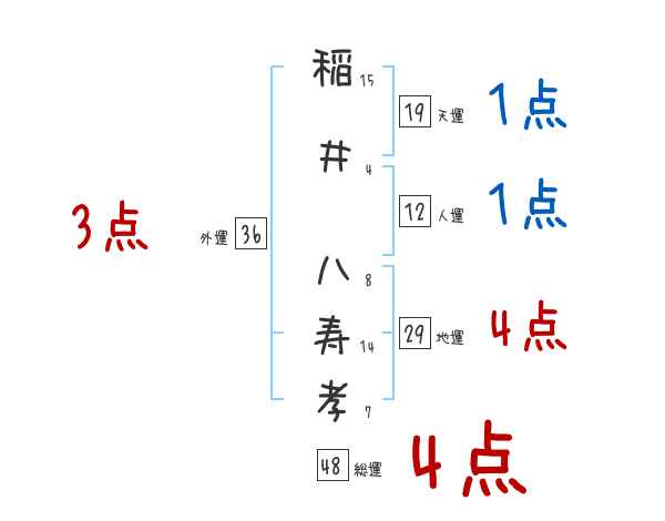 外運![]() | 稲井八寿孝さんの外運は36画の3つ星!先見性が豊かです。多少神経質で苦労することも。 生活面を象徴する運勢です。外部から受ける影響力を表し、結婚運、家庭運や職場、環境への順応性を表します。 |