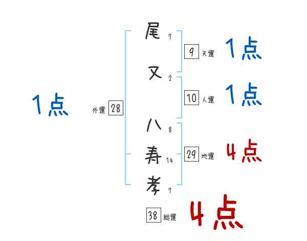 天運![]() | 尾又八寿孝さんの天運は9画の1つ星!消極的で才能を発揮することが苦手なことも。周りの意見に耳を傾けましょう。 家系が持つ宿命的な運勢を表します。祖先から受け継いだ苗字ですので自分の力が及びません。家柄を象徴します。 |