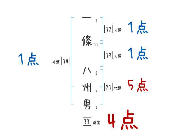 天運![]() | 一條八州男さんの天運は12画の1つ星!簡単な失敗で諦めてしまいやすいかも。着実に行動すると良いでしょう。 家系が持つ宿命的な運勢を表します。祖先から受け継いだ苗字ですので自分の力が及びません。家柄を象徴します。 |
