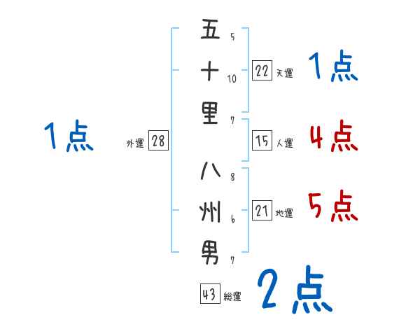 外運![]() | 五十里八州男さんの外運は28画の1つ星!家庭環境に注意。スポーツで活躍できる能力があるかも。 生活面を象徴する運勢です。外部から受ける影響力を表し、結婚運、家庭運や職場、環境への順応性を表します。 |