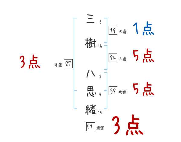 地運![]() | 三樹八思緒さんの地運は32画の5つ星!柔軟性があり成功する。チャンスが多く金運が良い。 個性を表す基礎的な運勢です。性格形成や対人関係、行動力など家庭環境に影響されます。主に誕生してから20歳くらいまでの若年期の運勢を表します。 |