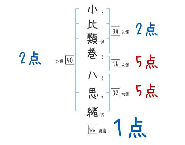 人運![]() | 小比類巻八思緒さんの人運は16画の5つ星!人望が厚く大きく発展する。逆転成功が見える。 性格や才能などを表す2番目に重要な運勢です。人間関係や協調性、社会的な成功に影響します。主に20歳から50歳ぐらいまでの中年期の運勢を表します。 |