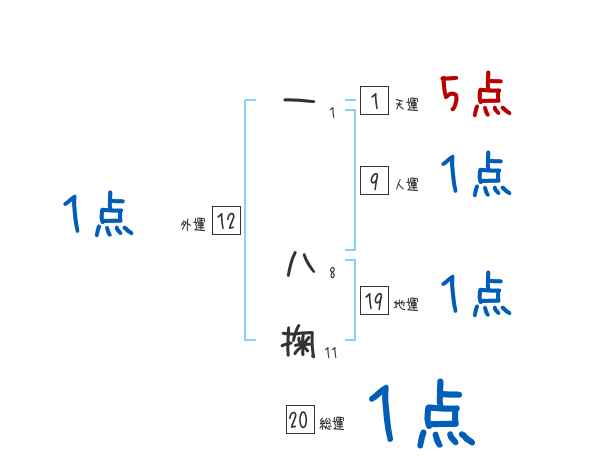 天運![]() | 一八掬さんの天運は1画の5つ星!行動力、指導力があり出世し繁栄する。幸運に恵まれる。 家系が持つ宿命的な運勢を表します。祖先から受け継いだ苗字ですので自分の力が及びません。家柄を象徴します。 |