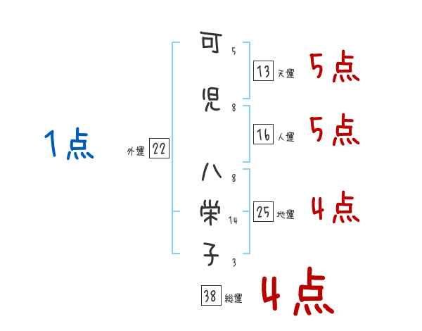 外運![]() | 可児八栄子さんの外運は22画の1つ星!努力することが苦手ないっぽう手先が器用。芸術性にも優れる。 生活面を象徴する運勢です。外部から受ける影響力を表し、結婚運、家庭運や職場、環境への順応性を表します。 |