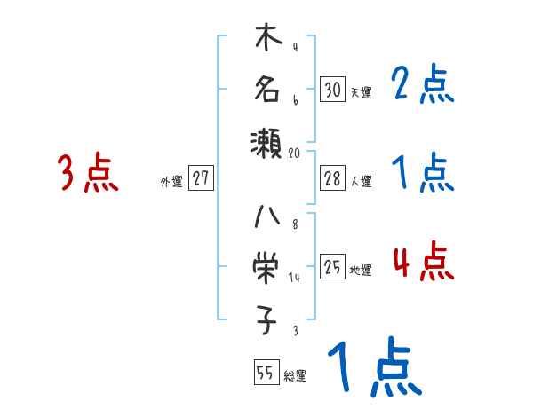 天運![]() | 木名瀬八栄子さんの天運は30画の2つ星!浮き沈みの激しさに注意しましょう。 家系が持つ宿命的な運勢を表します。祖先から受け継いだ苗字ですので自分の力が及びません。家柄を象徴します。 |