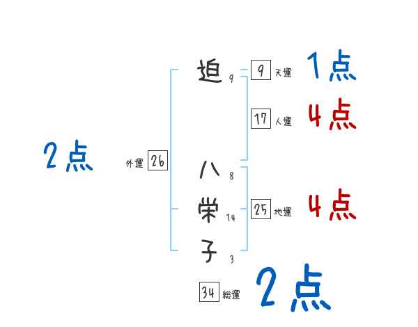 天運![]() | 迫八栄子さんの天運は9画の1つ星!消極的で才能を発揮することが苦手なことも。周りの意見に耳を傾けましょう。 家系が持つ宿命的な運勢を表します。祖先から受け継いだ苗字ですので自分の力が及びません。家柄を象徴します。 |