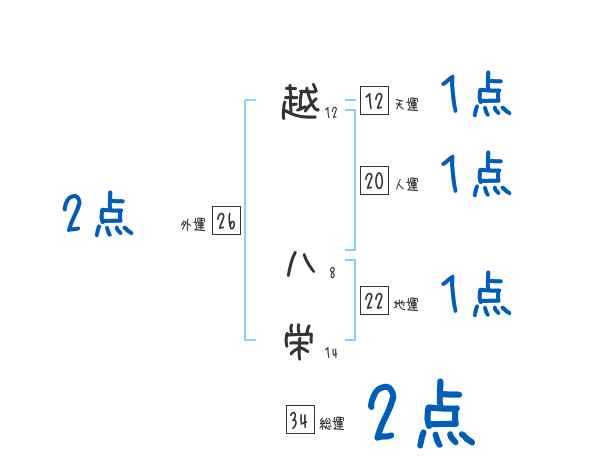 外運![]() | 越八栄さんの外運は26画の2つ星!波瀾万丈かも。信頼できる人を大事にしましょう。 生活面を象徴する運勢です。外部から受ける影響力を表し、結婚運、家庭運や職場、環境への順応性を表します。 |
