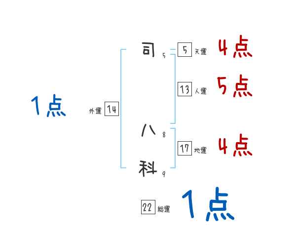 天運![]() | 司八科さんの天運は5画の4つ星!健康で安泰。協調性に優れ、財産に恵まれる。 家系が持つ宿命的な運勢を表します。祖先から受け継いだ苗字ですので自分の力が及びません。家柄を象徴します。 |