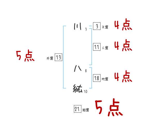天運![]() | 川八紘さんの天運は3画の4つ星!活動的で才能に恵まれ、多くの信頼を得る。希望に満ち成長する。 家系が持つ宿命的な運勢を表します。祖先から受け継いだ苗字ですので自分の力が及びません。家柄を象徴します。 |