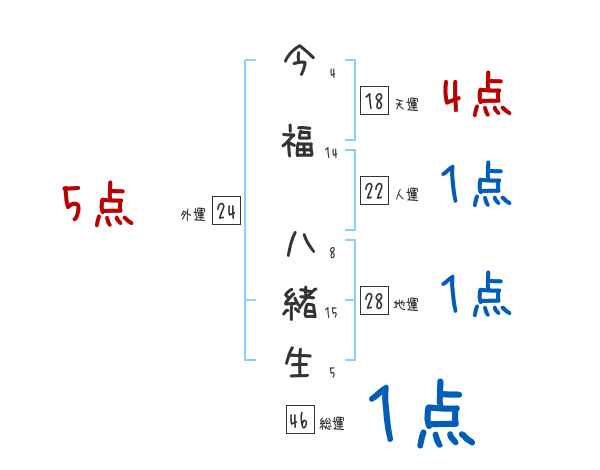 総運![]() | 今福八緒生さんの総運は46画の1つ星!迷走することが多く苦労するかも。目先のことにとらわれないように。 あなたの人生を表す1番重要な運勢です。生涯を通じて影響する総合運となり、主に50歳以降の晩年期に影響を及ぼします。 |