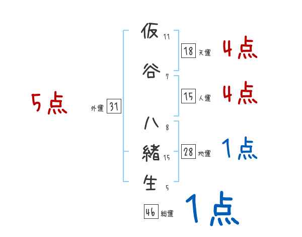 天運![]() | 仮谷八緒生さんの天運は18画の4つ星!情熱的で剛気。忍耐力があり信頼される。 家系が持つ宿命的な運勢を表します。祖先から受け継いだ苗字ですので自分の力が及びません。家柄を象徴します。 |