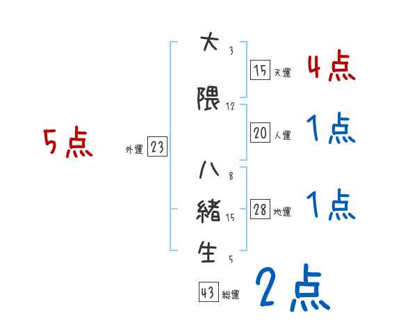 総運![]() | 大隈八緒生さんの総運は43画の2つ星!頑固な性格で独立心が強いかも。やや非現実的で浪費に注意しましょう。 あなたの人生を表す1番重要な運勢です。生涯を通じて影響する総合運となり、主に50歳以降の晩年期に影響を及ぼします。 |
