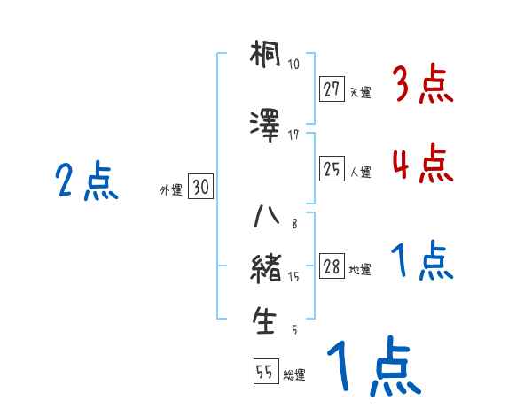 地運![]() | 桐澤八緒生さんの地運は28画の1つ星!家庭環境に注意。スポーツで活躍できる能力があるかも。 個性を表す基礎的な運勢です。性格形成や対人関係、行動力など家庭環境に影響されます。主に誕生してから20歳くらいまでの若年期の運勢を表します。 |