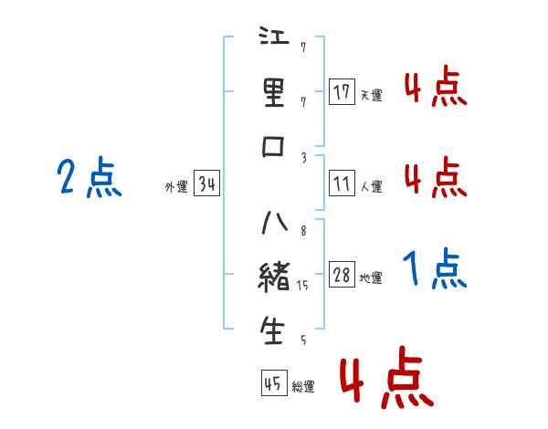 外運![]() | 江里口八緒生さんの外運は34画の2つ星!独創性に優れるが、自尊心が強く災難に注意しましょう。 生活面を象徴する運勢です。外部から受ける影響力を表し、結婚運、家庭運や職場、環境への順応性を表します。 |