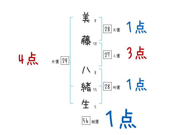 外運![]() | 美藤八緒生さんの外運は29画の4つ星!完全主義で才能がある。厳格な心の持ち主。 生活面を象徴する運勢です。外部から受ける影響力を表し、結婚運、家庭運や職場、環境への順応性を表します。 |