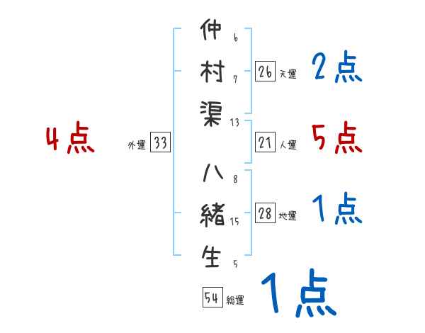 天運![]() | 仲村渠八緒生さんの天運は26画の2つ星!波瀾万丈かも。信頼できる人を大事にしましょう。 家系が持つ宿命的な運勢を表します。祖先から受け継いだ苗字ですので自分の力が及びません。家柄を象徴します。 |