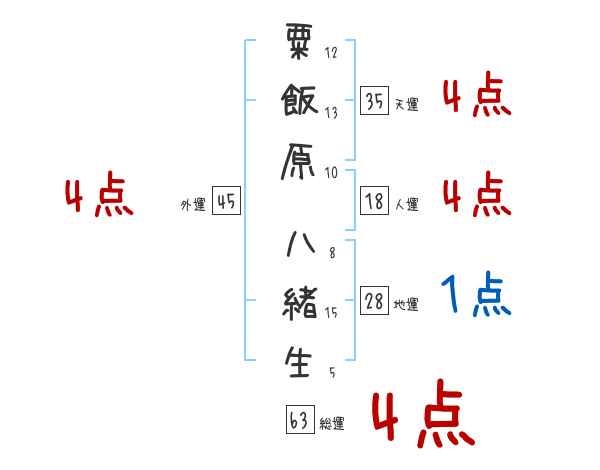 天運![]() | 粟飯原八緒生さんの天運は35画の4つ星!温厚な性格で感受性が高い。穏和な性格で人望が厚い。 家系が持つ宿命的な運勢を表します。祖先から受け継いだ苗字ですので自分の力が及びません。家柄を象徴します。 |