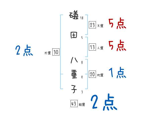 総運![]() | 礒田八重子さんの総運は43画の2つ星!頑固な性格で独立心が強いかも。やや非現実的で浪費に注意しましょう。 あなたの人生を表す1番重要な運勢です。生涯を通じて影響する総合運となり、主に50歳以降の晩年期に影響を及ぼします。 |