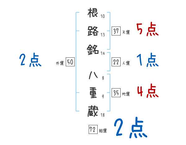 地運![]() | 根路銘八重蔵さんの地運は35画の4つ星!温厚な性格で感受性が高い。穏和な性格で人望が厚い。 個性を表す基礎的な運勢です。性格形成や対人関係、行動力など家庭環境に影響されます。主に誕生してから20歳くらいまでの若年期の運勢を表します。 |