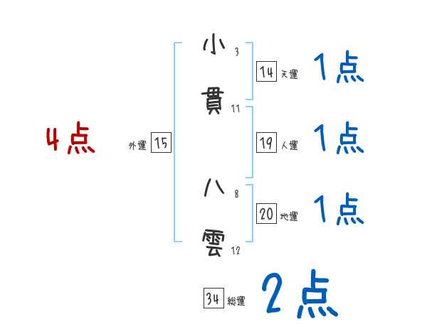 天運![]() | 小貫八雲さんの天運は14画の1つ星!人に対して優しいがストレスを溜め込みがち。人間関係のトラブルを避けるよう気をつけましょう。 家系が持つ宿命的な運勢を表します。祖先から受け継いだ苗字ですので自分の力が及びません。家柄を象徴します。 |