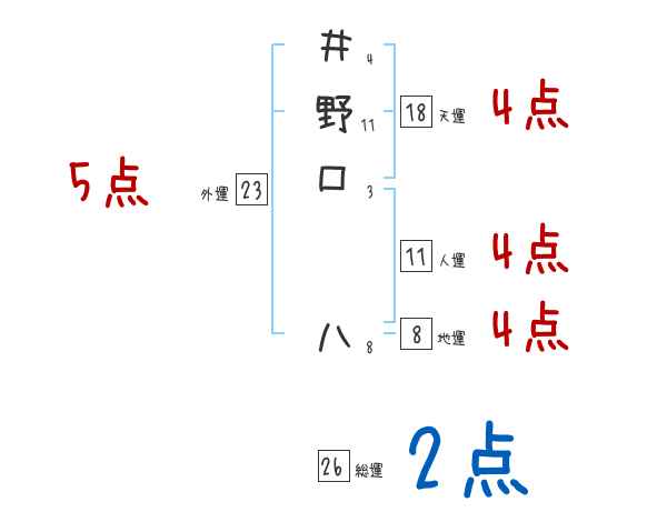 天運![]() | 井野口八さんの天運は18画の4つ星!情熱的で剛気。忍耐力があり信頼される。 家系が持つ宿命的な運勢を表します。祖先から受け継いだ苗字ですので自分の力が及びません。家柄を象徴します。 |