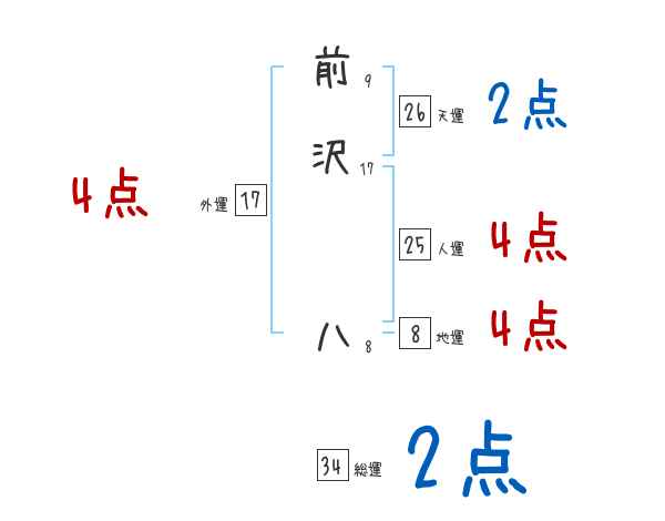総運![]() | 前沢八さんの総運は34画の2つ星!独創性に優れるが、自尊心が強く災難に注意しましょう。 あなたの人生を表す1番重要な運勢です。生涯を通じて影響する総合運となり、主に50歳以降の晩年期に影響を及ぼします。 |