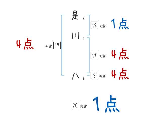 人運![]() | 是川八さんの人運は11画の4つ星!着実に富や地位を得る幸運な人生。 性格や才能などを表す2番目に重要な運勢です。人間関係や協調性、社会的な成功に影響します。主に20歳から50歳ぐらいまでの中年期の運勢を表します。 |