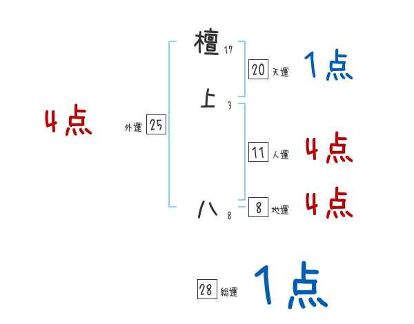 総運![]() | 檀上八さんの総運は28画の1つ星!家庭環境に注意。スポーツで活躍できる能力があるかも。 あなたの人生を表す1番重要な運勢です。生涯を通じて影響する総合運となり、主に50歳以降の晩年期に影響を及ぼします。 |