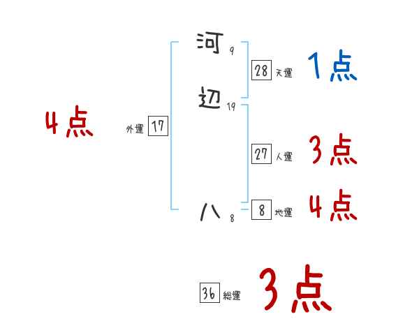 天運![]() | 河辺八さんの天運は28画の1つ星!家庭環境に注意。スポーツで活躍できる能力があるかも。 家系が持つ宿命的な運勢を表します。祖先から受け継いだ苗字ですので自分の力が及びません。家柄を象徴します。 |