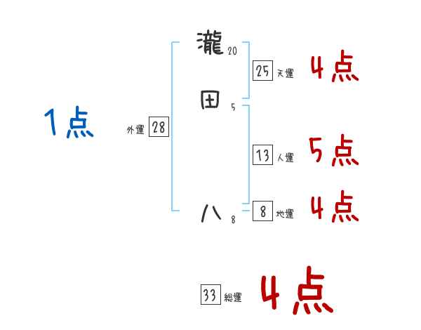 天運![]() | 瀧田八さんの天運は25画の4つ星!個性があり才能があふれる。強運の持ち主で発展する。 家系が持つ宿命的な運勢を表します。祖先から受け継いだ苗字ですので自分の力が及びません。家柄を象徴します。 |