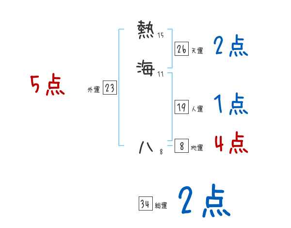 総運![]() | 熱海八さんの総運は34画の2つ星!独創性に優れるが、自尊心が強く災難に注意しましょう。 あなたの人生を表す1番重要な運勢です。生涯を通じて影響する総合運となり、主に50歳以降の晩年期に影響を及ぼします。 |