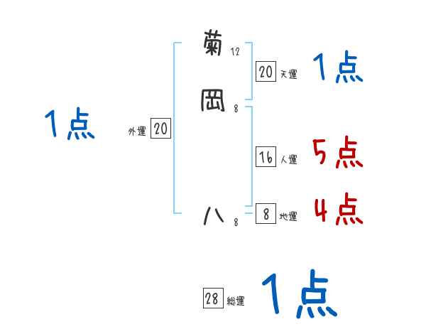 総運![]() | 菊岡八さんの総運は28画の1つ星!家庭環境に注意。スポーツで活躍できる能力があるかも。 あなたの人生を表す1番重要な運勢です。生涯を通じて影響する総合運となり、主に50歳以降の晩年期に影響を及ぼします。 |
