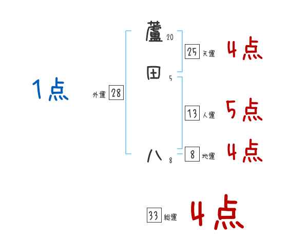 天運![]() | 蘆田八さんの天運は25画の4つ星!個性があり才能があふれる。強運の持ち主で発展する。 家系が持つ宿命的な運勢を表します。祖先から受け継いだ苗字ですので自分の力が及びません。家柄を象徴します。 |