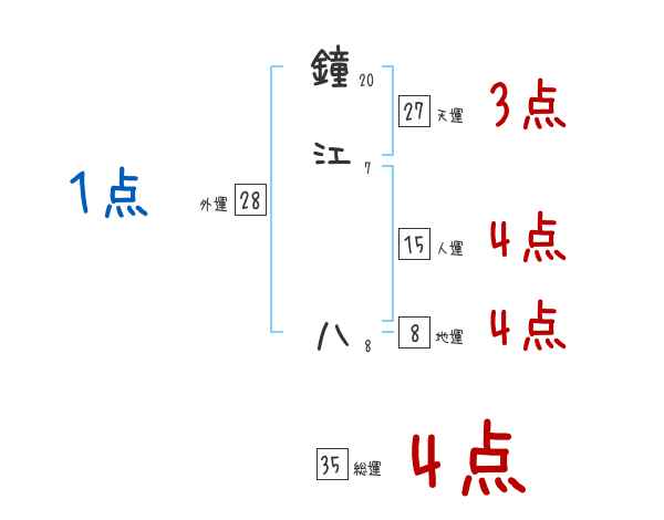 天運![]() | 鐘江八さんの天運は27画の3つ星!頭脳明晰だが強情で摩擦が多い傾向。孤立に注意。 家系が持つ宿命的な運勢を表します。祖先から受け継いだ苗字ですので自分の力が及びません。家柄を象徴します。 |