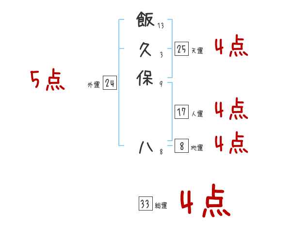 外運![]() | 飯久保八さんの外運は24画の5つ星!家庭運が良く順調な人生。金運にも恵まれる。 生活面を象徴する運勢です。外部から受ける影響力を表し、結婚運、家庭運や職場、環境への順応性を表します。 |
