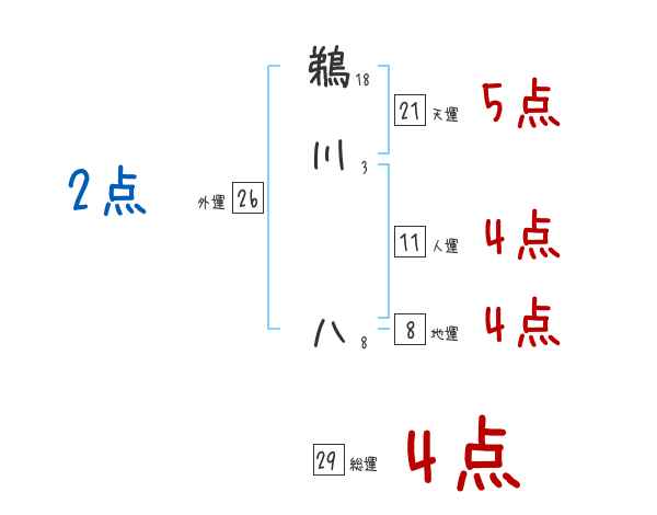 天運![]() | 鵜川八さんの天運は21画の5つ星!統率力がある。独立し成功する。名誉を手に入れる。 家系が持つ宿命的な運勢を表します。祖先から受け継いだ苗字ですので自分の力が及びません。家柄を象徴します。 |