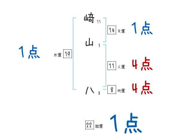 天運![]() | 﨑山八さんの天運は14画の1つ星!人に対して優しいがストレスを溜め込みがち。人間関係のトラブルを避けるよう気をつけましょう。 家系が持つ宿命的な運勢を表します。祖先から受け継いだ苗字ですので自分の力が及びません。家柄を象徴します。 |
