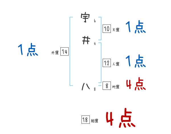 外運![]() | 宇井八さんの外運は14画の1つ星!人に対して優しいがストレスを溜め込みがち。人間関係のトラブルを避けるよう気をつけましょう。 生活面を象徴する運勢です。外部から受ける影響力を表し、結婚運、家庭運や職場、環境への順応性を表します。 |