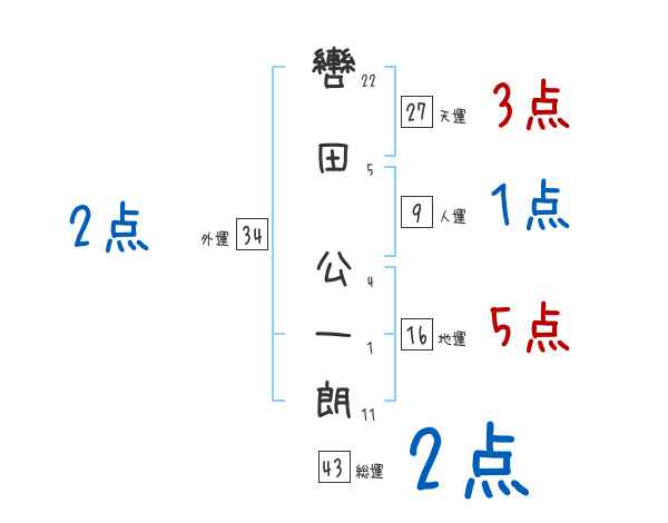 総運![]() | 轡田公一朗さんの総運は43画の2つ星!頑固な性格で独立心が強いかも。やや非現実的で浪費に注意しましょう。 あなたの人生を表す1番重要な運勢です。生涯を通じて影響する総合運となり、主に50歳以降の晩年期に影響を及ぼします。 |