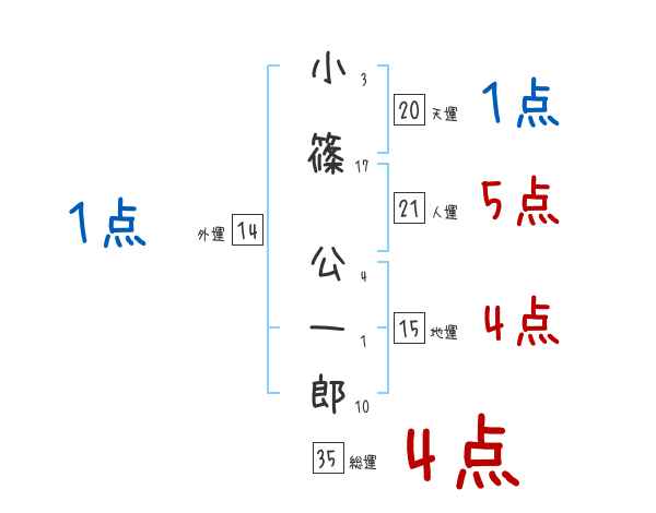 人運![]() | 小篠公一郎さんの人運は21画の5つ星!統率力がある。独立し成功する。名誉を手に入れる。 性格や才能などを表す2番目に重要な運勢です。人間関係や協調性、社会的な成功に影響します。主に20歳から50歳ぐらいまでの中年期の運勢を表します。 |
