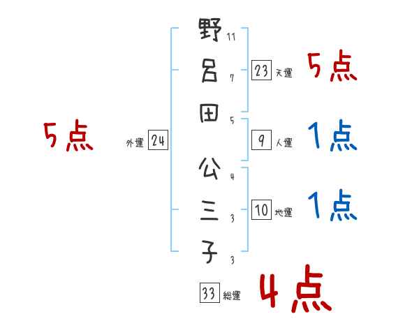 外運![]() | 野呂田公三子さんの外運は24画の5つ星!家庭運が良く順調な人生。金運にも恵まれる。 生活面を象徴する運勢です。外部から受ける影響力を表し、結婚運、家庭運や職場、環境への順応性を表します。 |