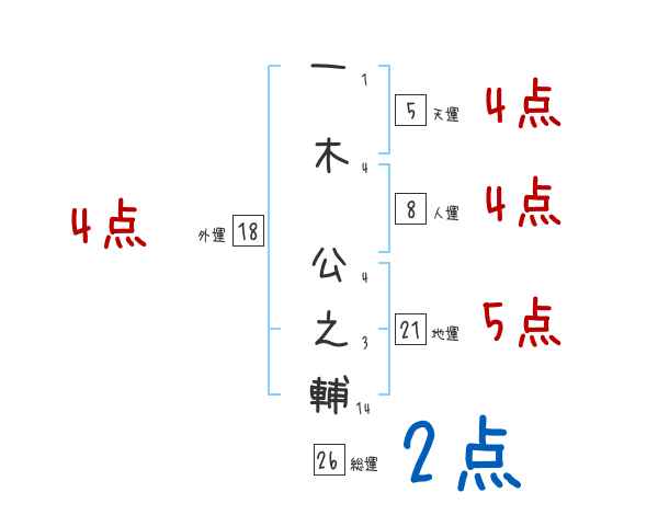 天運![]() | 一木公之輔さんの天運は5画の4つ星!健康で安泰。協調性に優れ、財産に恵まれる。 家系が持つ宿命的な運勢を表します。祖先から受け継いだ苗字ですので自分の力が及びません。家柄を象徴します。 |